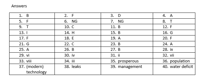 Other ways of protecting supplies are to reduce water loss resulting from 38 ……………….. in the supply systems and to find ways of utilising used water. Longer term measures, such as improved environmental 39 ……………….. . would protect the ecosystem and ensure the replenishment of ground water for future generations. Without such measures, future supplies are uncertain, especially when global warming is expected to interfere with rainfall patterns and to worsen the 40 ……………….. already suffered by many countries today.