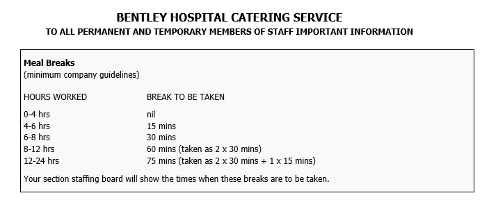 It is your responsibility to check that the total break time shown on the staffing sheets accurately reflects the breaks that you take. Any discrepancies should be raised with your Staff Co-ordinator immediately.
