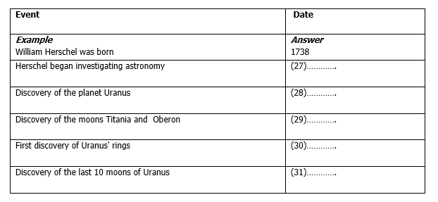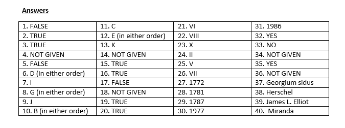 The suggested names of the new planet started with …….. (37) …….., then …….. (38) ……., before finally settling on Uranus. The first five rings around Uranus were discovered by …….. (39) ……… From 1948 until 1986, the moon …….. (40)…….. was believed to be the moon closest to the surface of Uranus.