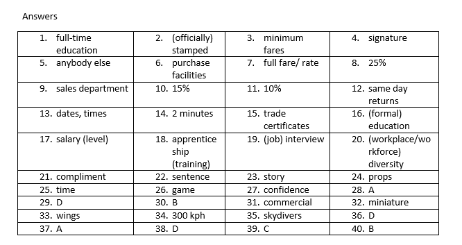 An elderly person who is also studying full-time receives a concession of 8………. Large groups people who want to reserve seats should get in touch with the 9……..If travellers cancel their trip, they will usually receive back the ticket price less 10………… or they may change the date of their trip by paying 11……… of the original value. These concessions do not apply in the case of 12………… It is the passenger’s responsibility to make sure the 13……. and ……….. are correct.