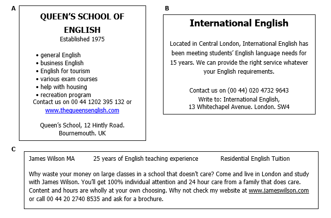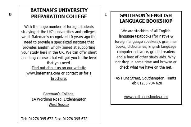 Answer the questions below by writing the letters of the appropriate advertisement in boxes 1 – 6 on your answer sheet. Your answer may require more than one.