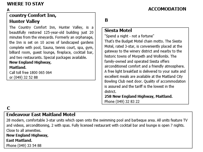 There are four advertisements on the next page for places to stay near Morpeth. Answer the questions below by writing the letters of the appropriate advertisements in boxes 4-7 on your answer sheet.