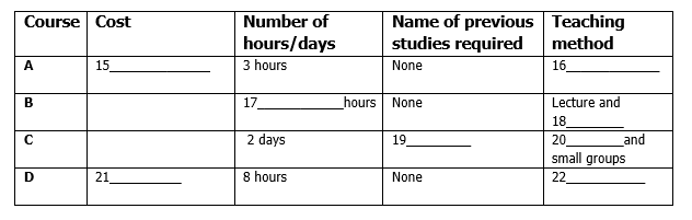 Below is a chart summarising information about the Numeracy Centre courses. Complete the required details using information from the passage. Write your answers in boxes 15-22 011 your answer sheet.