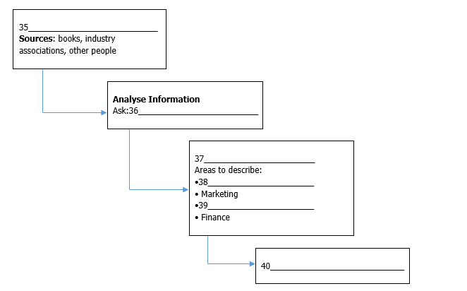 The text describes how to make a business plan. Choose the correct word or phrase from the box to complete the following flow chart of how to make a business plan. Write its letter in boxes 35-40 all your answer sheet.