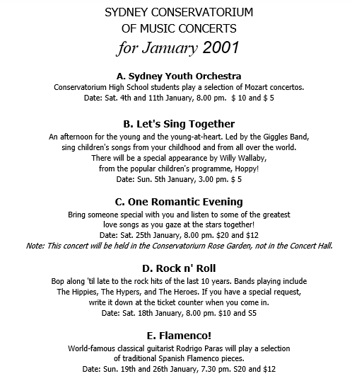 Read the advertisements for musical concerts below and answer the questions that follow.