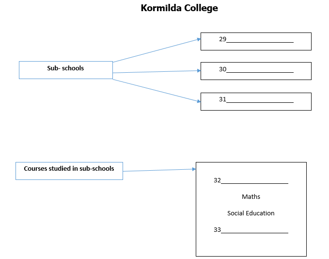 The following diagram shows how Kormilda College is organised. Complete the diagram using information from the text. Use NO MORE THAN THREE WORDS for each answer. Write your answers in boxes 29-33 on your answer sheet.