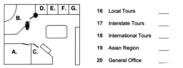 Identify the rooms in the office plan. Write the correct letter A-G next to questions 16-20.