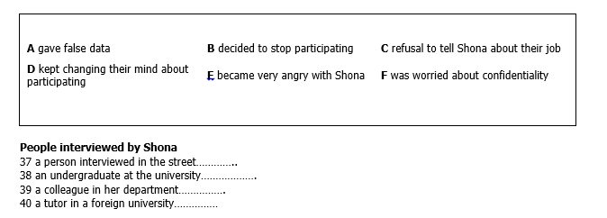 Choose FOUR answers from the box and write the correct letter, A-F, next to questions 37-40.