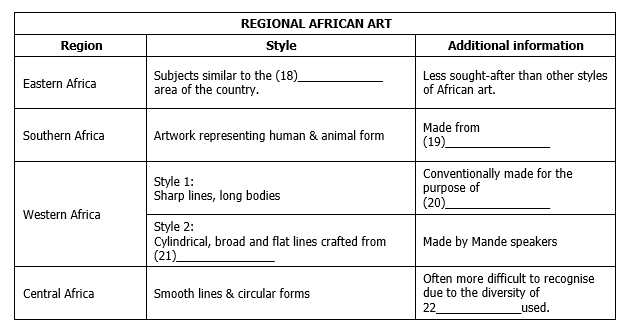 In Africa, sculpture is more predominant and more highly (14)______________ than canvas art, for example. In Asia, many prestigious works are connected to (15)______________ values. Sculpture is an ancient art in which figurines are created from materials which are, in the main, (16)_____________ to ensure longevity of the art form; however, though more (17)____________, materials such as ice are used in certain spheres.