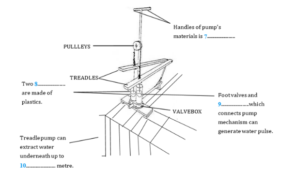 Filling the blanks in diagram of treadle pump’s each parts. Choose NO MORE THAN THREE WORDS AND/OR A NUMBER from the passage for each answer.