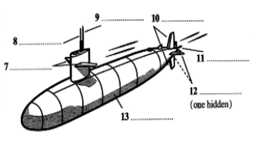 Underwater, there are two controls for steering the submarine. The rudder (like a tail fin) controls side-to-side movement, and diving planes influence rise and descent. There are two sets of diving planes: the forward sail planes and the stem planes, which are located at the back with the rudder and propeller.