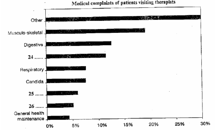 According to the Australian Journal of Public Health, 18% of patients visiting alternative therapists do so because they suffer from muscular-skeletal complaints; 12% suffer from digestive problems, which is only 1% more than those suffering from emotional problems. Those suffering from respiratory complaints represent 7% of their patients, and candida sufferers represent an equal percentage. Headache sufferers and those complaining of general ill health represent 6% and 5% of patients respectively, and a further 4% see therapists for general health maintenance.