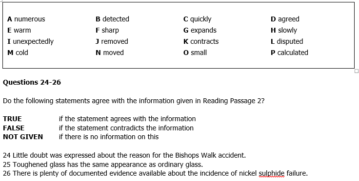 The outer layer (21) ……………….. before the inner layer, and the tension between the two layers which is created because of this makes the glass stronger. However, if the glass contains nickel sulphide impurities, crystals of nickel sulphide are formed. These are unstable, and can expand suddenly, particularly if the weather is (22)…………………….. If this happens, the pane of glass may break. The frequency with which such problems occur is (23) ……………….. by glass experts. Furthermore, the crystals cannot be detected without sophisticated equipment.