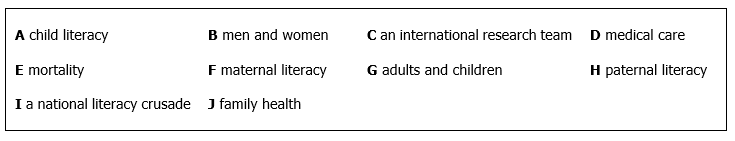 The Nicaraguan National Literacy Crusade aimed to teach large numbers of illiterate (14) ……………… to read and write. Public health experts have known for many years that there is a connection between child health and (15)……………… However, it has not previously been known whether these two factors were directly linked or not. This question has been investigated by (16)……………….. in Nicaragua. As a result, factors such as (17)…………………. and attitudes to children have been eliminated, and it has been shown that (18)……………. can in itself improve infant health and survival.