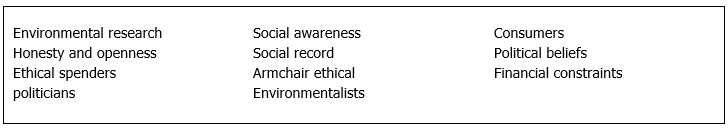 The Mintel report suggests that in future companies will be forced to practise greater (10)………………………… in their dealings because of the increased awareness amongst (11)……………………………. of ethical issues. This prediction is supported by the growth in the number of (12)…………………………… identified in the most recent survey published. As a consequence, it is felt that companies will have to think more carefully about their (13)………………………..