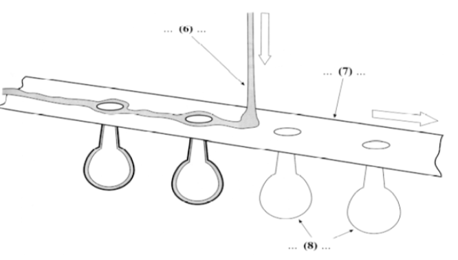 The diagram below shows the principle of Corning’s ribbon machine. Label the diagram by selecting NO MORE THAN THREE WORDS from the Reading Passage to fill each numbered space. Write your answers in boxes 6-8 on your answer sheet.