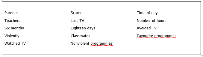 A study that was published in January 2001 found that when children (14)………………………….less, they behaved less (15)……………………..Students in a California elementary school participated in the study, which lasted (16)……………………….By the end of the study, title children’s behavior had changed. For example, the children’s (17)…………………………reported that the children were acting less violently than before. During the study, the children kept a record of the (18)…………………….they watched TV. Then, for ten days, they (19)……………………….Near the end of the study, the students began to suggest watching (20)………………