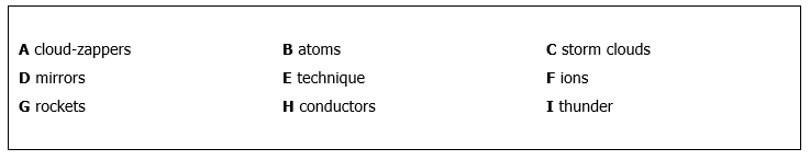 In this method, a laser is used to create a line of ionisation by removing electrons from (7) ………………. This laser is then directed at (8) ………………….. in order to control electrical charges, a method which is less dangerous than using (9) ………………….. As a protection for the lasers, the beams are aimed firstly at (10) …………………..