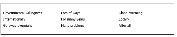 There are (8)……………………in attempting to stop the effects of (9)……………………… One is the problem of predicting change. Another is a lack of (10) …………………….. to change the situation; most governments’ interest in the problem is limited because the problem will not become very serious (11)…………………………Finally, there is the problem of what action we should actually take. One solution is both to keep an eye on the situation as it develops, and to push for changes (12)………………………. Even if we do this, the problem is not going to (13)……………………., since it takes a considerable time for global warming to happen.