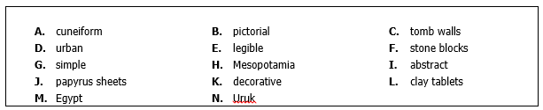 Most archaeological evidence shows that the people of (37)……………………………invented writing in around 3,300 BC. Their script was written on (38)……………………………and was called (39)………………………………..Their script originally showed images related to political power and business, and later developed to become more (40)………………………….