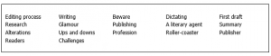 Once the publication has been embarked upon, there is a long period of turmoil as the text takes shape. A first draft is rarely the final text of the book. Nearly all books are the result of countless hours of altering and re-ordering chunks of text and deleting the superfluous bits. While some people might think that with new technology the checking and editing process is sped up, the experienced writer would hardly agree. Unfortunately, advanced technology now allows the writer the luxury of countless editings; a temptation many writers find hard to resist. So a passage, endlessly re-worked may end up nothing remotely like the original, and completely out of place when compared with the rest of the text.