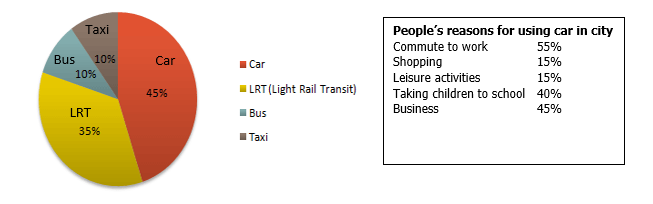 The pie chart shows the proportion of four different modes of transports, namely: car, LRT, bus, and taxi, while the table illustrates the purposes of using cars in the city of Edmonton.