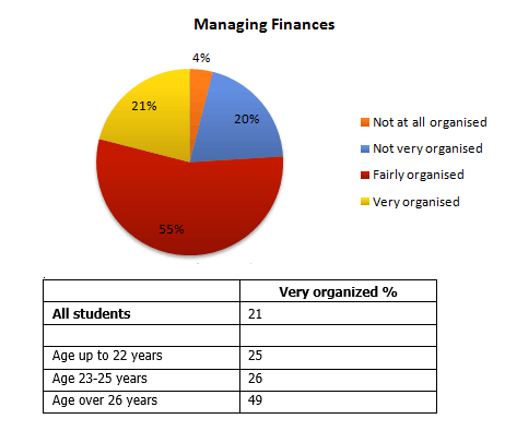 Overall, as per pie chart highest percentage of UK students says that they can fairly organised to manage finance and as per tabular graph students more than age 26 years can organised very well in managing finances.