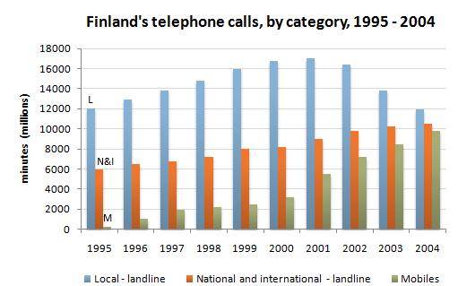 Task 1: The chart below shows the total number of minutes (in millions) of telephone calls in Finland, divided into three categories, from 1995 – 2004.