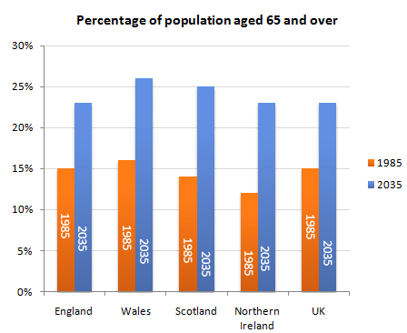 Task 1: The chart below gives information about the UK’s ageing population in 1985 and makes predictions for 2035.