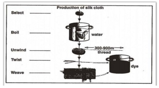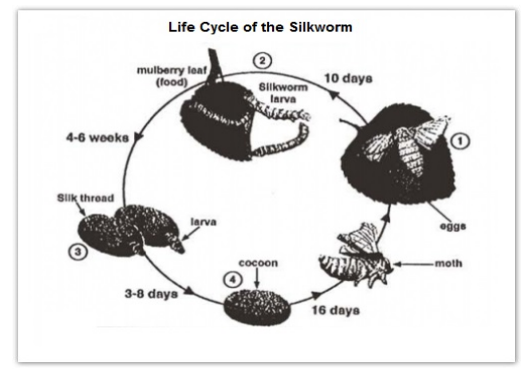 Task 1: The diagrams below show the life cycle of the silkworm and the stages in the production of silk cloth. Summarise the information by selecting and reporting the main features, and make comparisons where relevant.