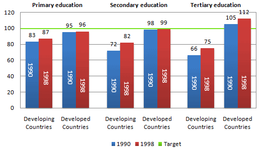 As per the graph, in the tertiary education, the number of girls per 100 boys swelled from 66 in 1990 to 75 in 1998 in developing countries. Additionally, 105 girls per 200 boys went to take education in developed countries in 1990 and the number of girls per 200 boys rose to 112 girls in 1998.