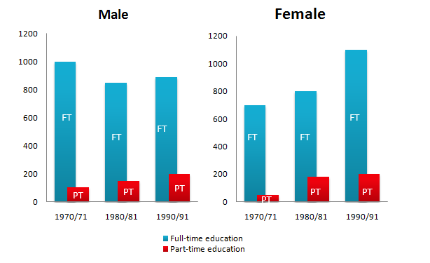 In term of males full-time education in 1970 was higher than the other two periods and reached about 1000 students. Furthermore, women full-time education were the lowest students as opposed to students of 1980 and 1990, so from what is shown in the chart, it was just over 600 students. In period two which was 1980, the males full-time education were slow down until reached approximately 800 students. In contrast of women full-time education that they increased to be almost 800 students. In the end of males full-time education, they evaporated near to 1000 students again. In women full-time education, they roses fast till just over 1200 students.
