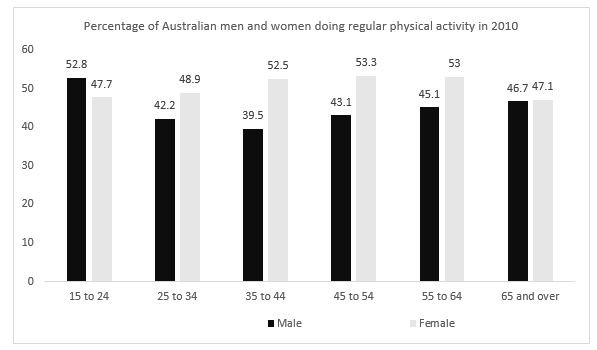The given chart compares the proportion of Australian men and women of six age groups who did regular physical exercise in 2010.