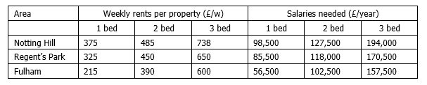 The table reveals the weekly rents per property and salaries in different parts of London.