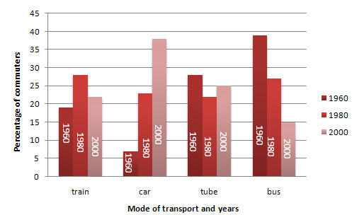 Task 1: The graph below shows the different modes of transport used to travel to and from work in London in 1960, 1980 and 2000.