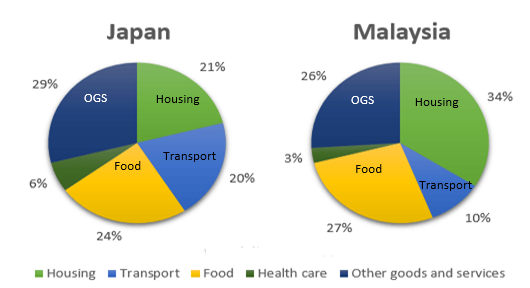 Task 1: The pie charts below show the average household expenditures in Japan and Malaysia in the year 2010.