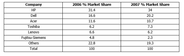 Task 1: The table below shows the worldwide market share of the notebook computer market for manufacturers in the years 2006 and 2007.
