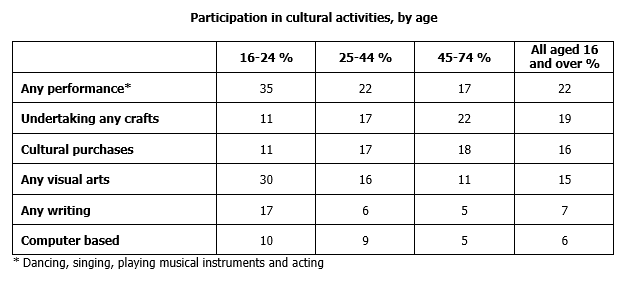 Task 1: The Table below shows the results of a survey that asked 6800 Scottish adults (aged 16 years and over) whether they had taken part in different cultural activities in the past 12 months.