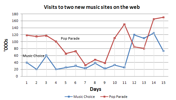 Task 1: The graph below compares the number of visits to two new music sites on the web.