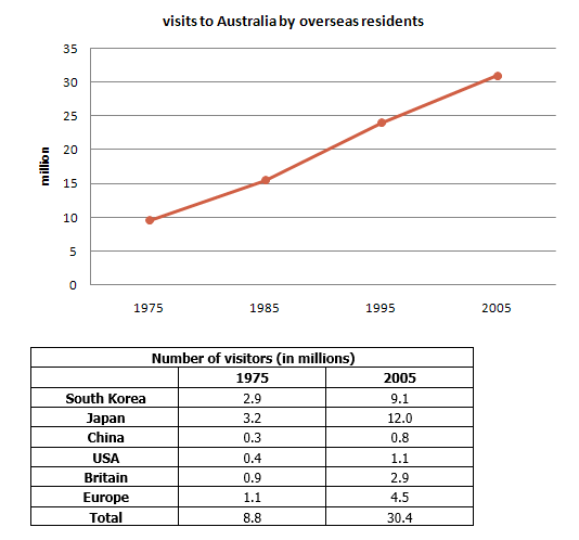 Task 1: The line graph below shows the number of annual visits to Australia by overseas residents. The table below gives information on the country of origin where the visitors came from.