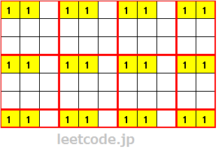 这道题要想到一个贪心思想,如果要保证全局矩阵中1的数量最多,那么,我们可以将矩阵以sideLength * sideLength分割成N个部分(矩阵边缘会存在不完全子矩阵),其中每个部分中1所在的相对位置要保持一致。比如像下面这个样子: