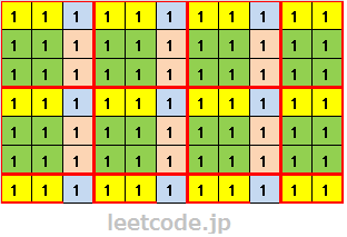 一个11*7的矩阵,我们使用3*3的子矩阵对其进行分割(红色边框),分割后,存在6个完整的3*3子矩阵,以及2个2*3子矩阵,3个3*1子矩阵,和1个2*1子矩阵。如果在黄色区域标记1,相应的我们可以得到4*3=12个1。绿色区域则是4*2=8个1,蓝色区域为3*3=9个1,粉色区域为3*2=6个1。 最后我们统计能被影射出来最多的前 maxOnes 个的和即是结果。
