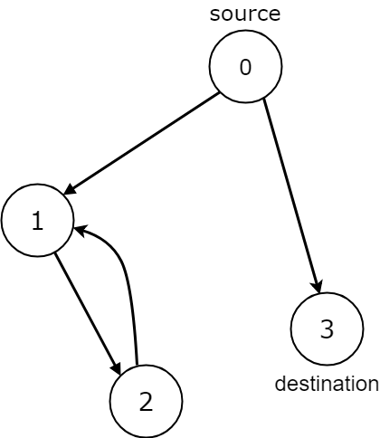 Input: n = 4 , edges = [[0,1],[0,3],[1,2],[2,1]] , source = 0 , destination = 3 Output: false Explanation: We have two possibilities: to end at node 3, or to loop over node 1 and node 2 indefinitely.