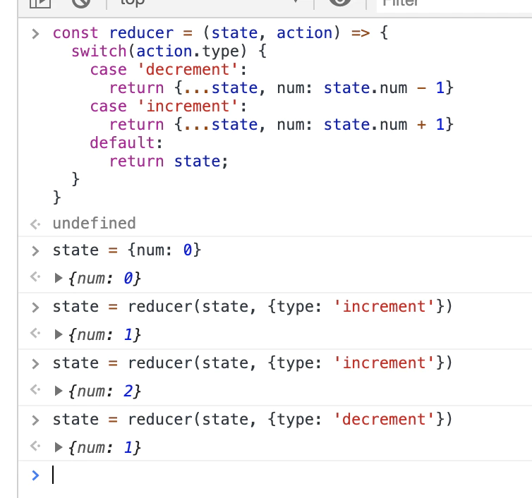 可以看到useReducer的逻辑脱离了UI,可以独立复用。reducer就是一个单纯的Js方法,我们可以对reducer进行单独测试,甚至可以在chrome中进行调试
